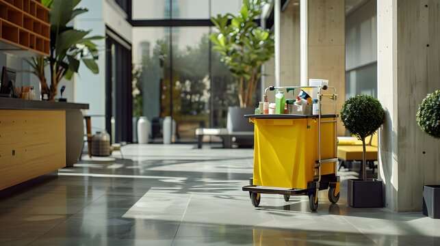 A hotel cleaning cart with supplies and equipment in an office building lobby, representing the high quality service that you can expect to clean your place after.