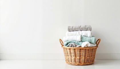 Neatly organized laundry basket filled with folded towels, spring cleaning