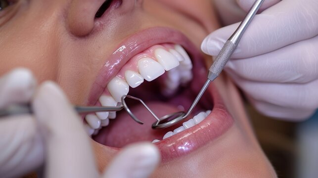 Detailed view of a dentist using a dental explorer during a standard teeth examination