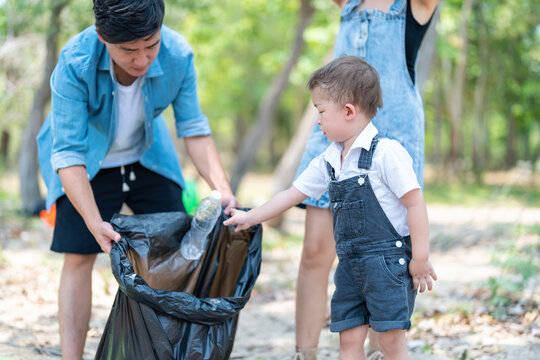 Asian family picking up trash in the forest. Litter cleanup activities. Environment protection. recycling.