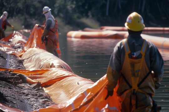 cleanup crew deploying oil containment booms around spill site