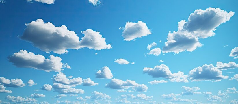 Blue sky background with white clouds in summer. Soft white clouds float in the clear blue sky. Clear blue sky, bright spring, soft sky gradient, wallpaper landscape, aerial view.