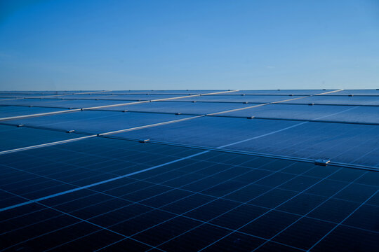 A large solar panel array is seen from above. The panels are blue and are arranged in a grid pattern. The sky is clear and the sun is shining brightly. Concept of clean energy and sustainability