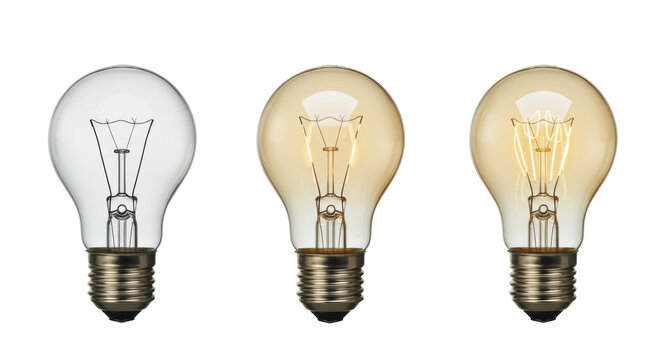 Three modern light bulbs, clear glass, intricate filaments, unlit to bright amber glow, arranged horizontally on white studio background, concept of innovation and bright ideas