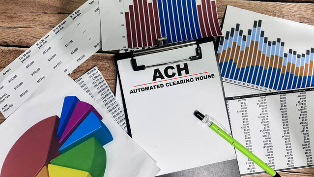 Concept of ACH - Automated Clearing House write on paperwork isolated on Wooden Table.
