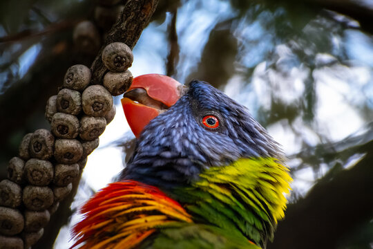 This koala just woke up and is enjoying some fresh eucalyptus leaves. Shot at Cleland Wildlife Park, Australia.