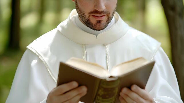 Priest Reading a Bible in Nature, Clergyman in White Robe Reading Scripture Outdoors
