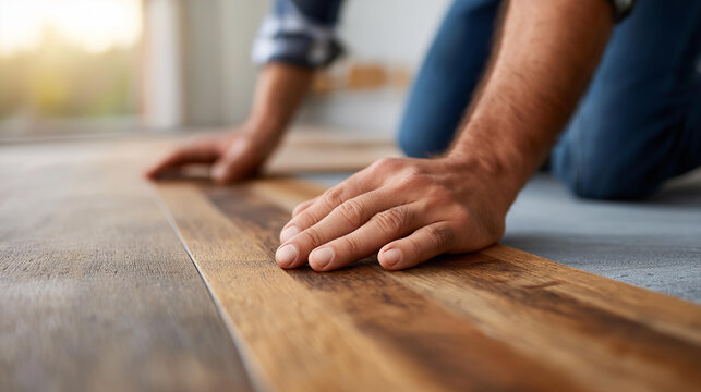 Floating floor installation work, faceless worker inserts vinyl plank board to click system of floating floor, residential flooring installation, home renovation project, professio