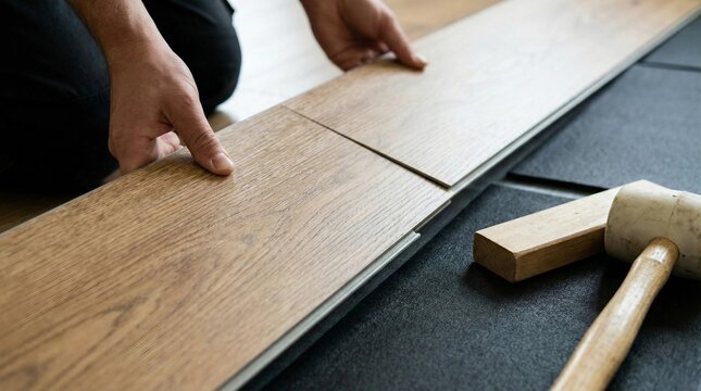 Interlocking vinyl flooring being clicked into place on a new floor