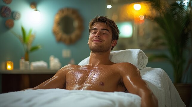 Leaning male therapist pressing client's back at clinic table, wearing white shirt, chat bubbles