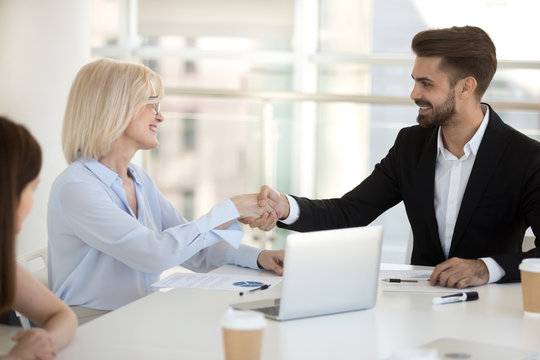 50s business lady shake hands greeting caucasian millennial businessman surrounded by multi ethnic businesspeople in formal suits. Sign contract express trust, partnership, start group meeting concept