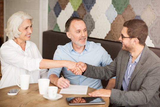 Handsome middle-aged businessman wearing a suit, sitting at a table and talking to his female customer in a modern office