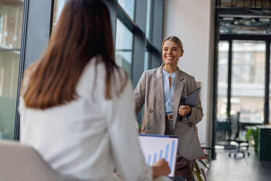 Two skilled professionals engage in a pleasant and friendly business meeting within a stylish modern office space