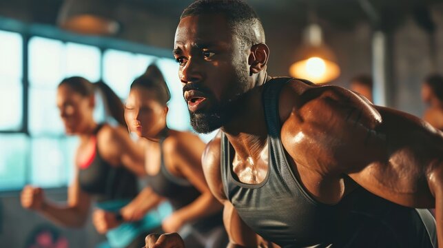 A personal trainer guiding clients through a high-intensity interval training (HIIT) session.
