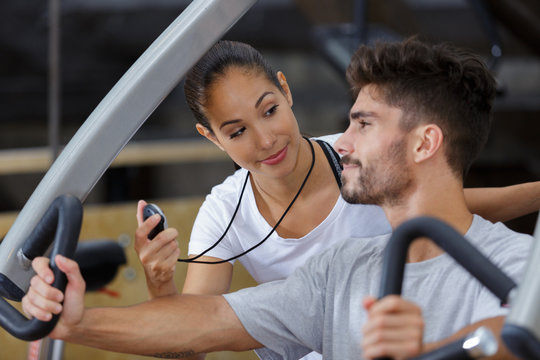 Just like that. Cropped shot of a female fitness instructor taking her male client through a workout in the gym.