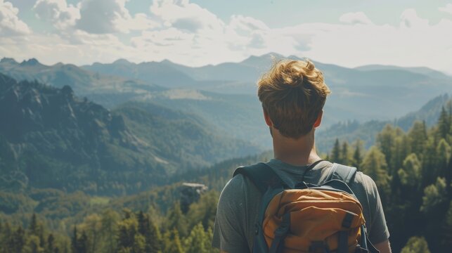 Young male explorer hiking by rocky cliff in wilderness