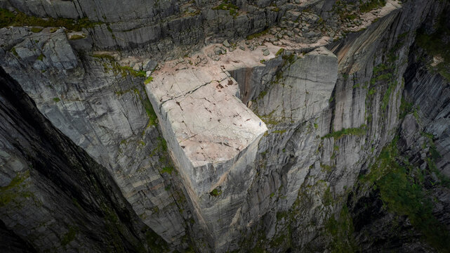 A man standing on the edge of the cliff Preikestolen in Norway. Moody summer weather and beautiful scenery.