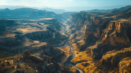 A breathtaking aerial view of a vast canyon landscape, showcasing dramatic cliffs, winding river, and distant mountains under a clear blue sky.