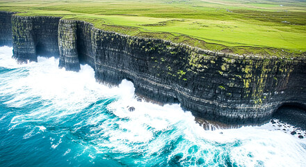 Scenic aerial view of rocky chalk cliffs overlooking turquoise ocean