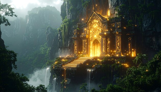Majestic temple perched cliffside, surrounded by lush greenery and misty landscape sunrise