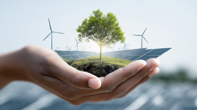 Hand holding small landscape with tree, solar panels, and wind turbines symbolizes renewable energy and environmental sustainability. image conveys hope and innovation