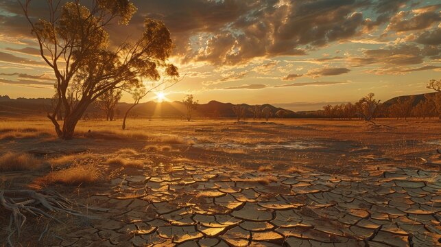 A haunting image of the outback landscape bearing the scars of climate change, with cracked and dry earth serving as a poignant