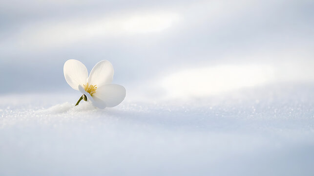 Single white flower delicately nestled in a bed of sparkling snow, illuminated by soft sunlight, embodies a serene winter's tale. A study in contrasts and minimalist beauty.