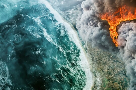 Half green and half burning planet Earth with trees clouds fire and cracked ground showing climate crisis
