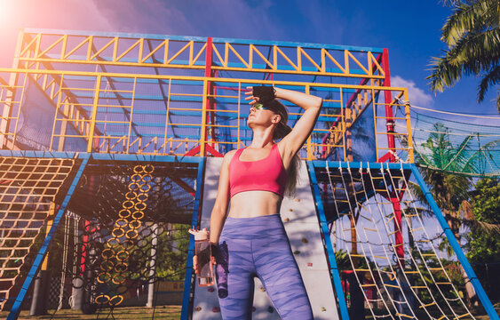 Caucasian woman climbing net at outdoor fitness bootcamp