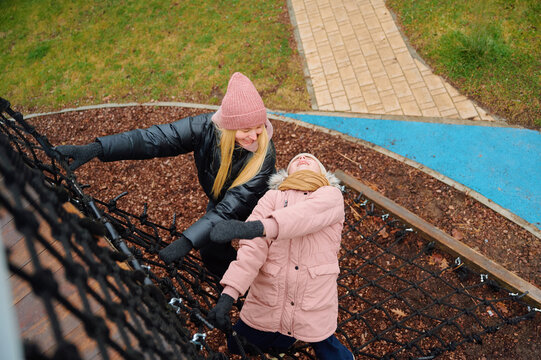 happy toddler girl playing with climbing ropes net at a outdoor playground in park