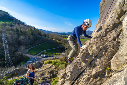 Female climber ascending rock face with instructor belaying in scenic landscape