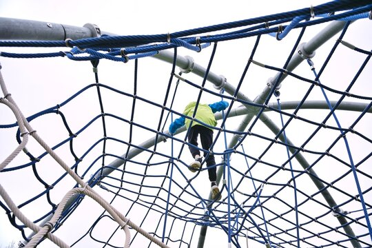 Boy climbing on rope climber net at playground. Kids outdoor activities background.