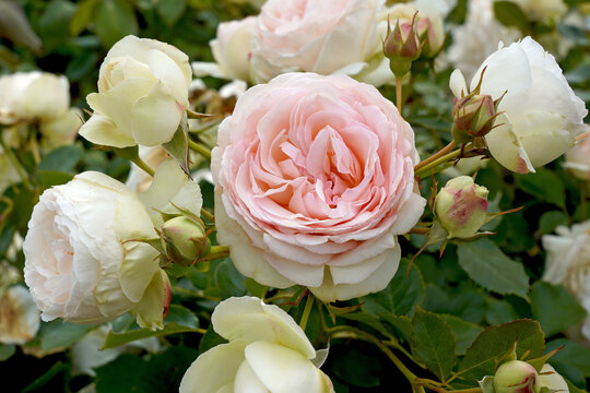 Delicate pink roses blooming in lush green garden