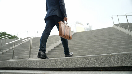 Top view of smart business man walking up stairs with bag in the hand. Professional project manager climb up the stair and going to workplace. Increasing skill, getting promotion, traveling. Exultant.