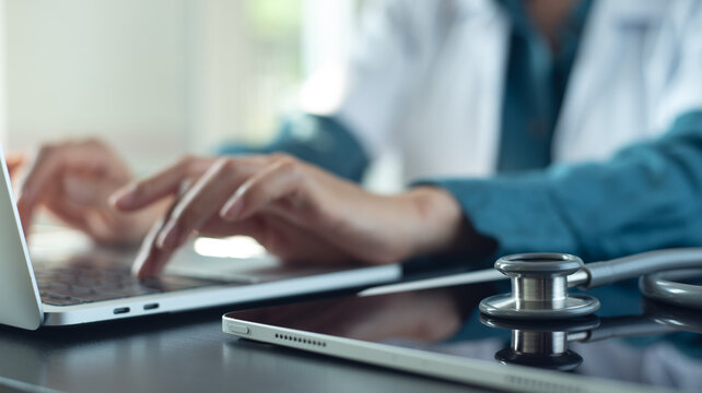 Closeup, stethoscope with doctor working on laptop computer and digital tablet on table in hospital office. Healthcare and medicine, medical technology background