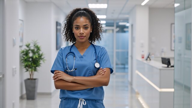 Confident black female doctor in blue scrubs posing in a hospital corridor. Portrait of a young african american nurse with a stethoscope and arms crossed. Healthcare and medicine professional