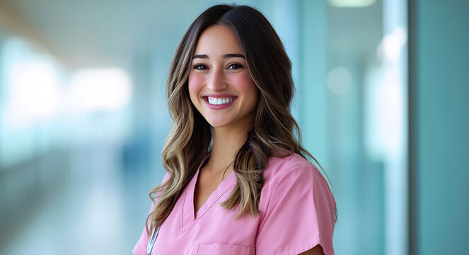 Smiling nurse wearing blue scrubs and stethoscope promoting modern clinical care
