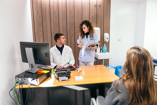 Doctor and nurse reviewing patient file in clinic office, stethoscope, teamwork