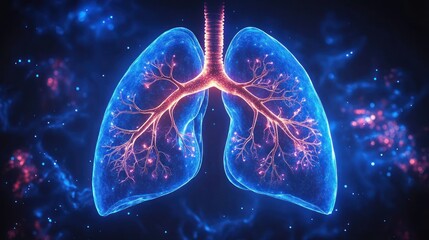 Detailed digital visualization of human lungs with glowing airways and bronchial tree highlighted in bright neon colors against a dark background, illustrating respiratory anatomy