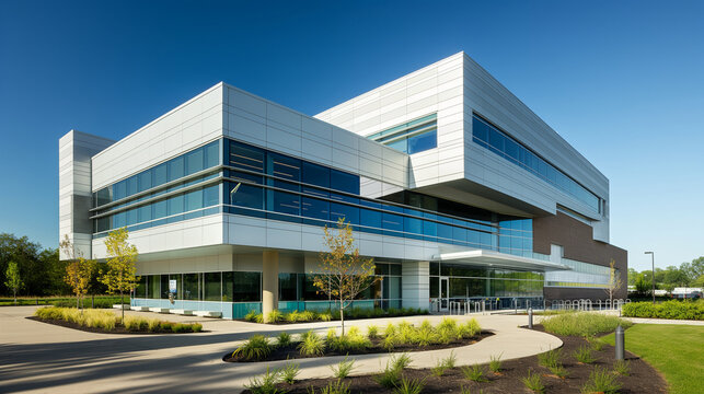 Exterior shot of a modern clinical research facility, architectural lines and bright signage, left third copy space