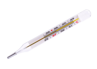 Mercury thermometer showing high temperature 39 isolated on a white background