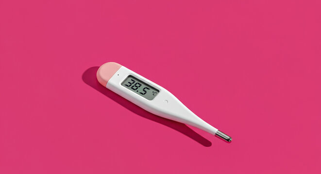 Digital thermometer displaying a temperature of 38.5°C on a pink background