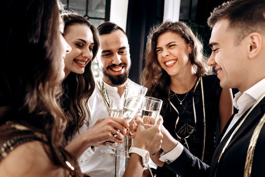 Сompany of friends dressed in stylish elegant clothes stand together and clink glasses with champagne. Party time