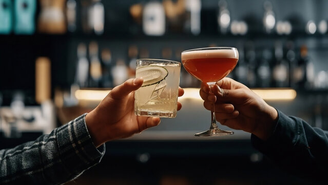 Friends clinking beer glasses at bright bar counter celebrating toast and conversation