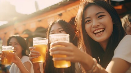 Cheers to friendship! Three friends enjoy a night out, clinking beer cups together. Fictional Character Created By Generative AI.
