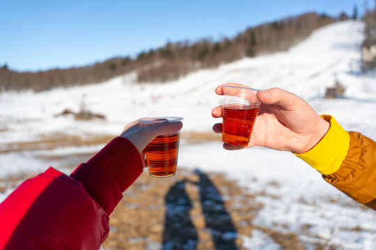 Two people’s hands clinking plastic cups filled with hot tea while standing in a snowy landscape on a sunny winter day