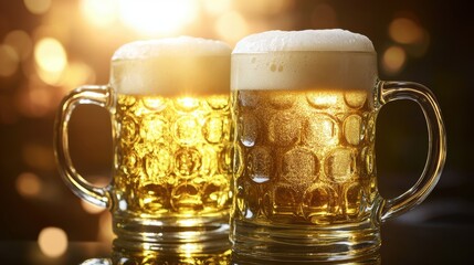 Golden glass beer mugs clinking together in celebration, set against a warm, glowing pub atmosphere. Perfect for beer, celebrations, and festive moments in casual dining settings.