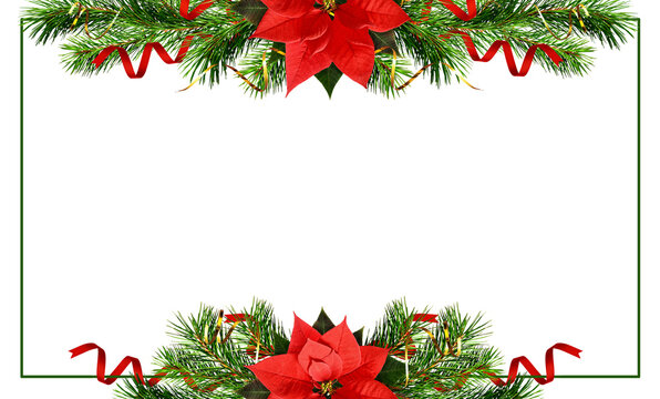 Christmas tree branches, bells and red poinsettia flower in a holiday frame isolated on white or transparent background