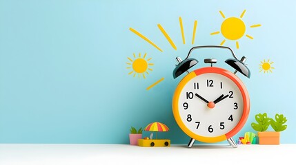 Vibrant alarm clock ringing as it transitions from spring to summer time with warm sun rays and cheerful outdoor elements featured in a lively stylized