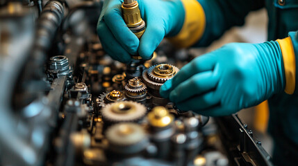Skilled hands assembling gears in a machine workspace Generative AI